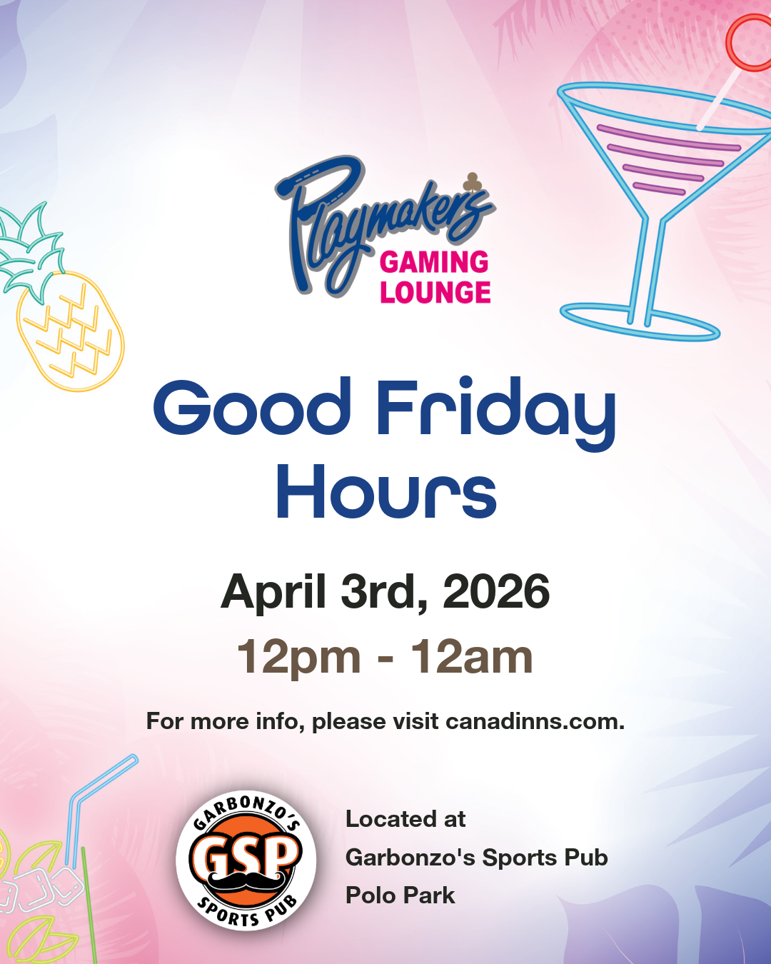 Heads up! We will be open on Friday, April 3rd at Playmaker's Gaming Lounge located inside Garbonzo's Sports Pub Polo Park from 12pm - 12am.