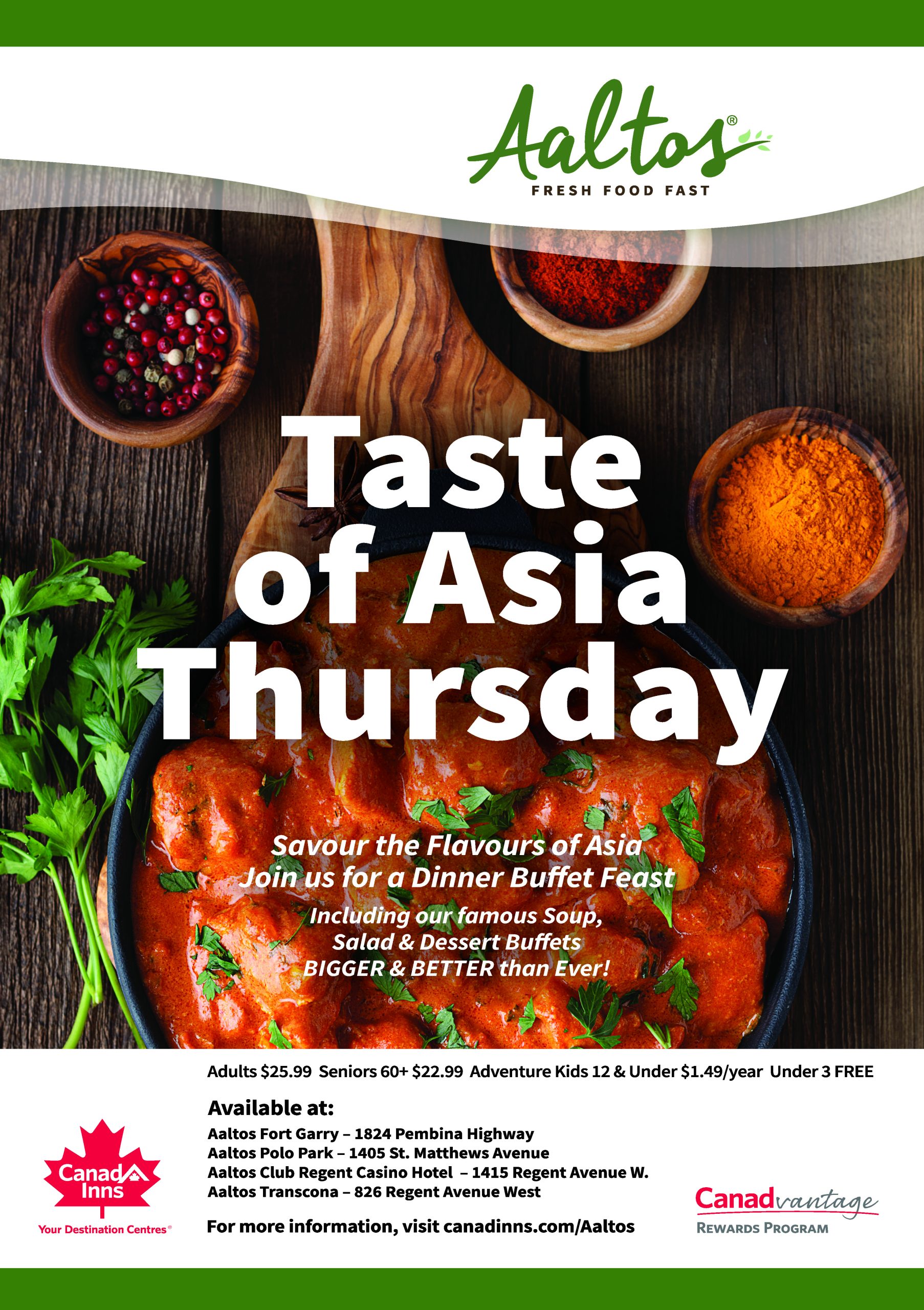 Dive into a world of comfort with Classic Homestyle Dinner Buffet. Includes our Soup, Salad & Dessert Buffet! Available at: Aaltos Fort Garry - 1824 Pembina Highway Aaltos Polo Park […] |