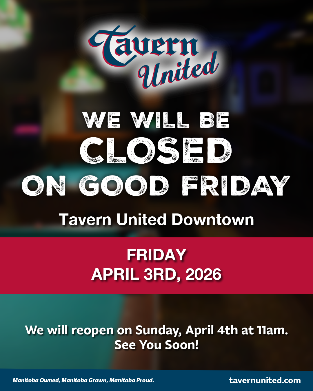 Heads up! Tavern United Downtown will be closed on Good Friday. We’ll see you soon for cold drinks, great food and game day vibes.