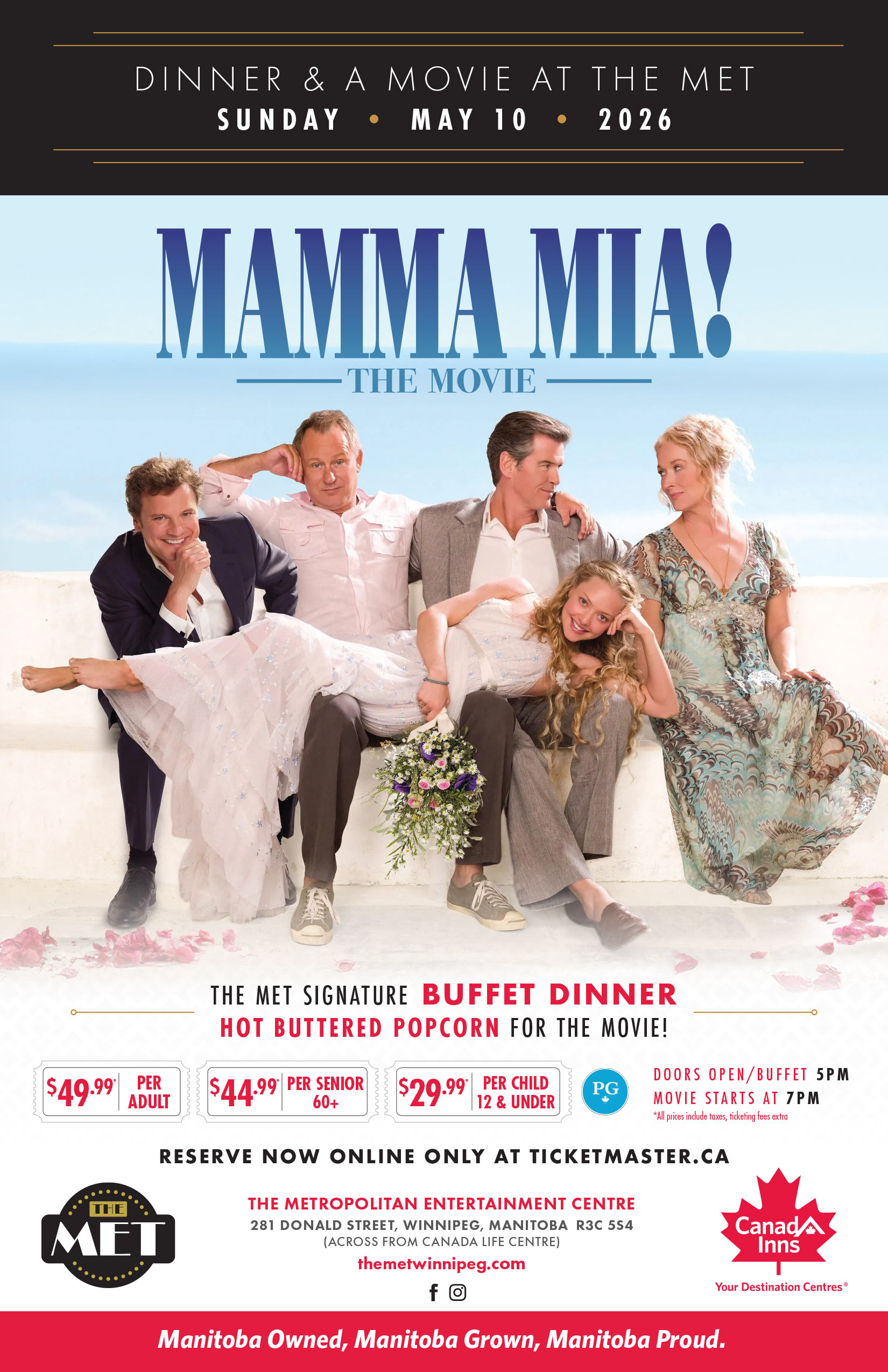 Enjoy a dinner buffet from 5:00 PM to 7:00 PM, followed by a screening of Mamma Mia! at 7:00 PM. Before the movie begins, guests will be served hot buttered popcorn to enjoy during the show.